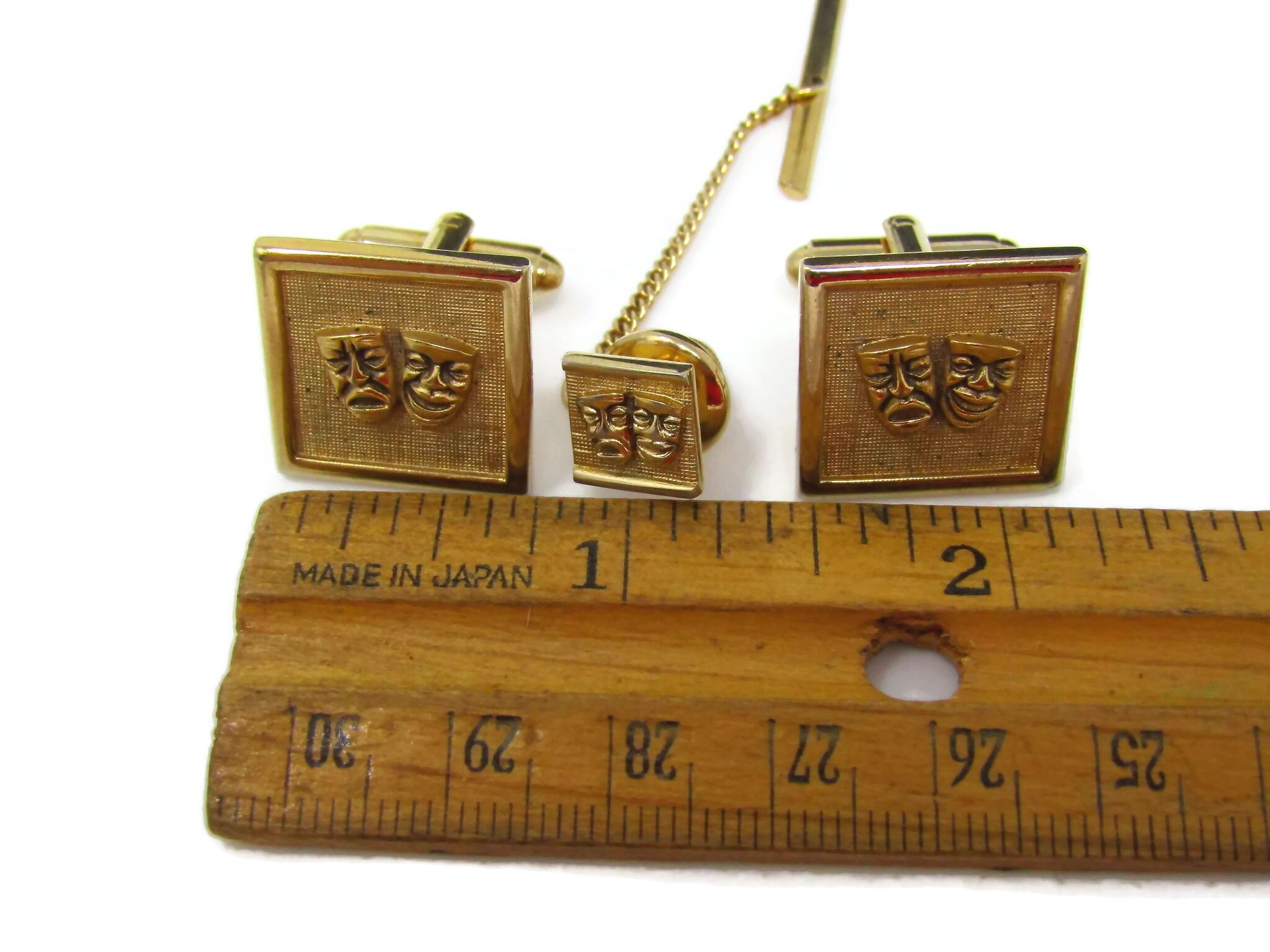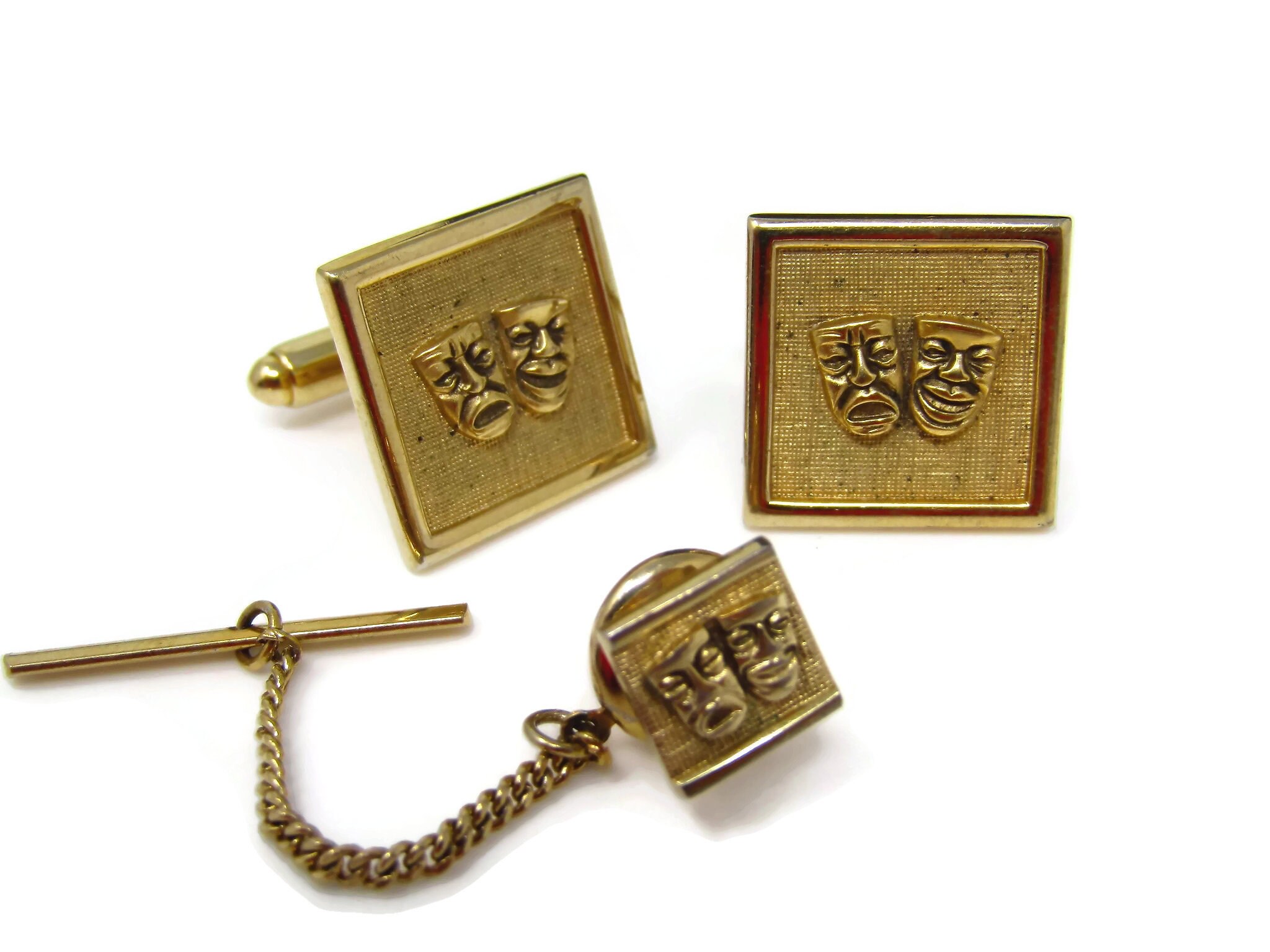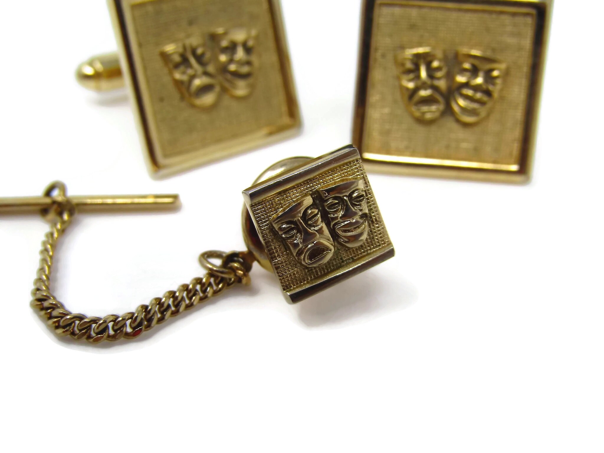 Vintage Mens Jewelry Set Tie Tack Pin Cufflinks: Comedy & Tragedy Mask Actor Gift Gold Tone