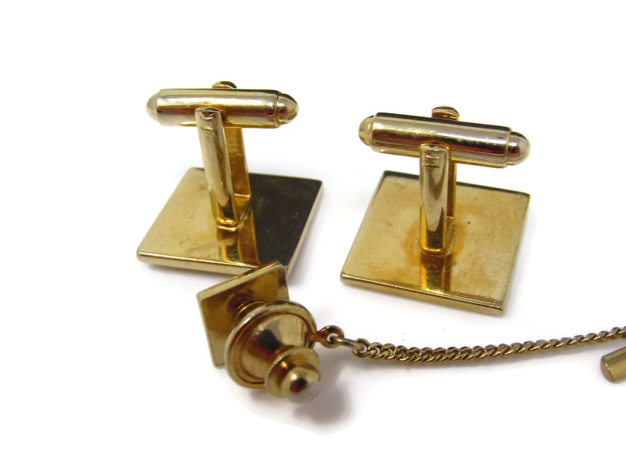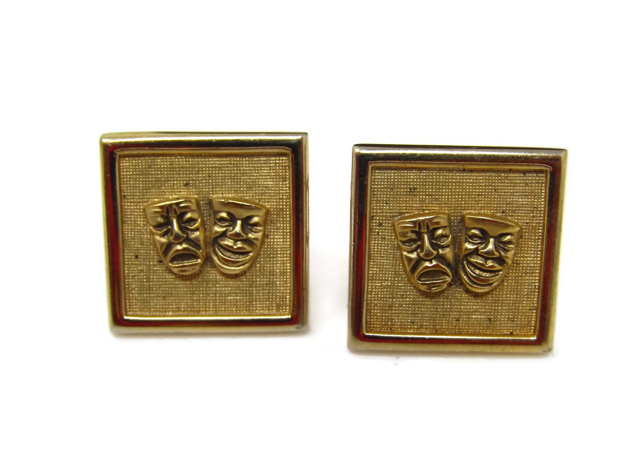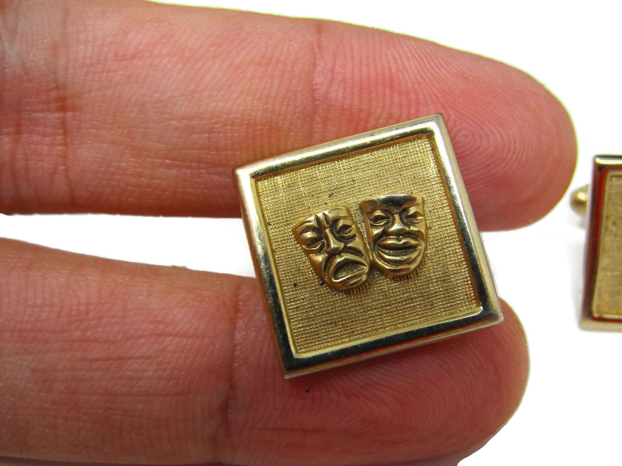 Vintage Mens Jewelry Set Tie Tack Pin Cufflinks: Comedy & Tragedy Mask Actor Gift Gold Tone