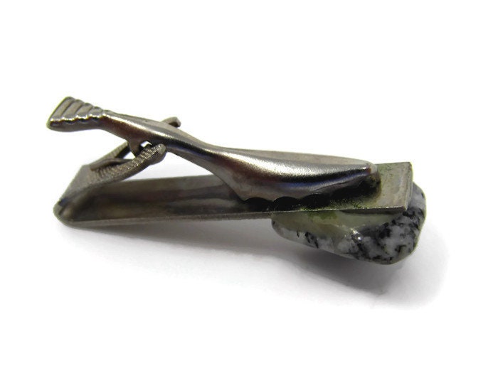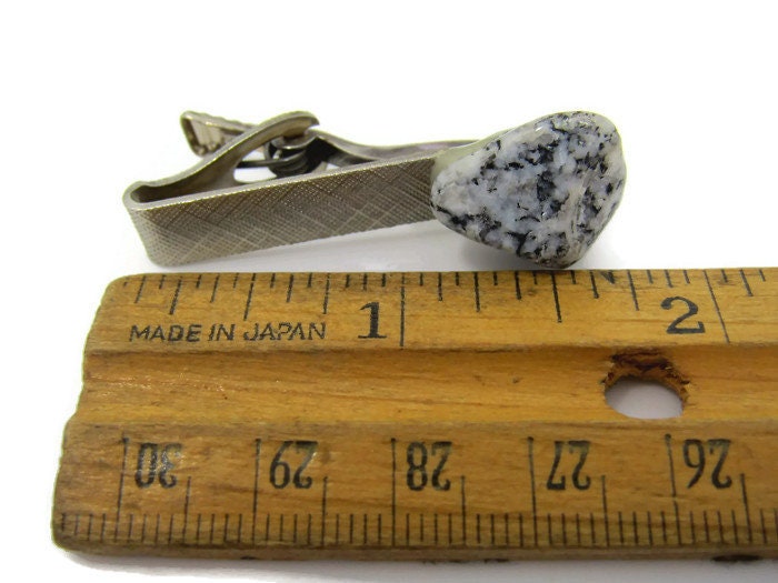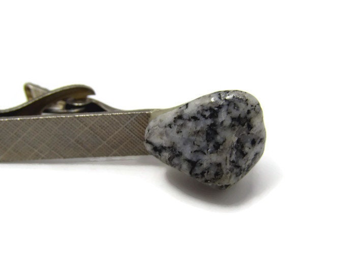 Black & White Stone Tie Clip Vintage Tie Bar: Textured Silver Tone