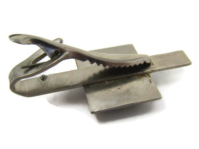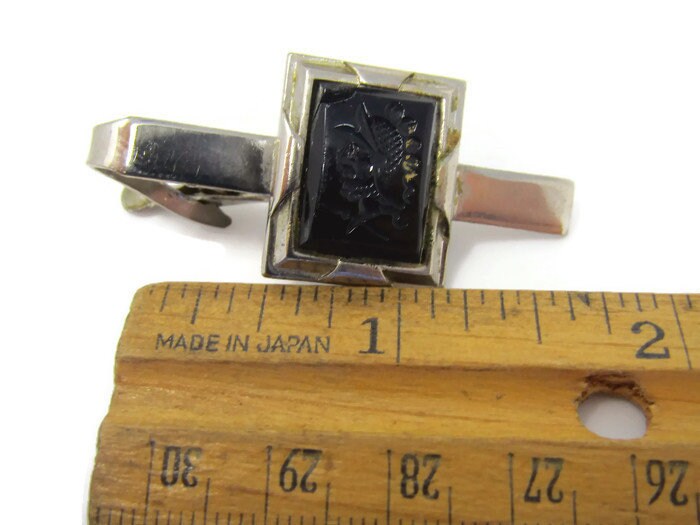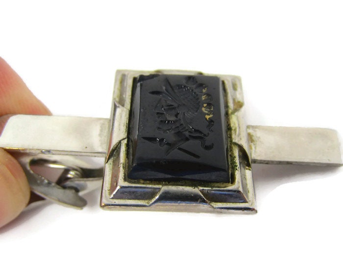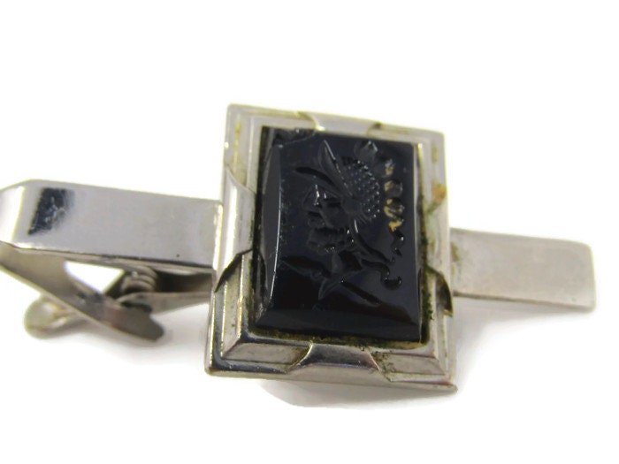 Glass Etch Warrior Tie Clip Vintage Tie Bar: Silver Tone Body