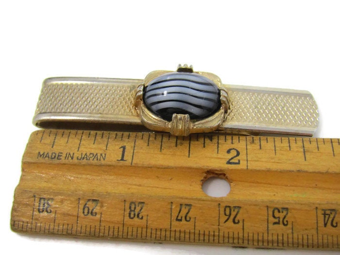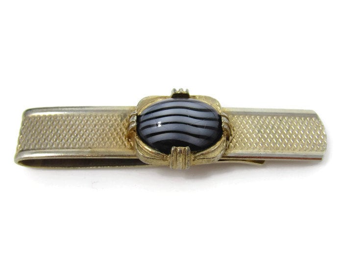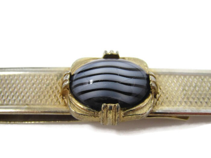 White & Black Striped Glass Tie Clip Vintage Tie Bar: Textured Gold Tone Body