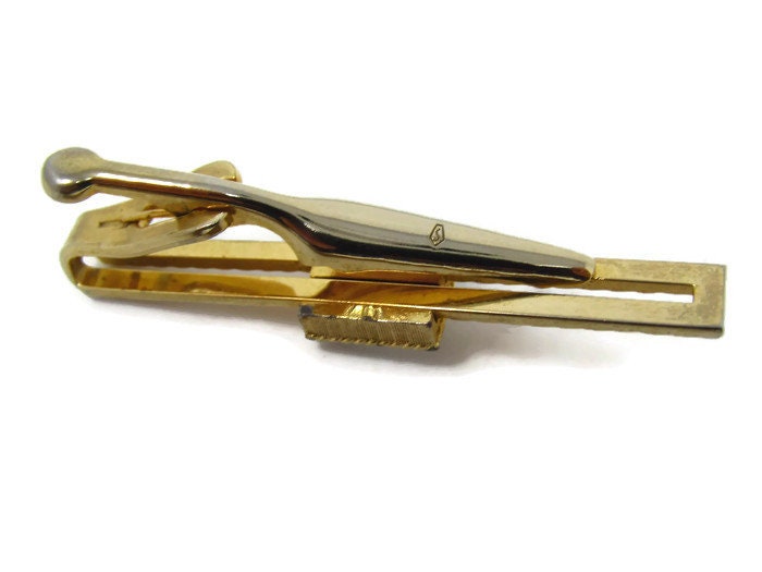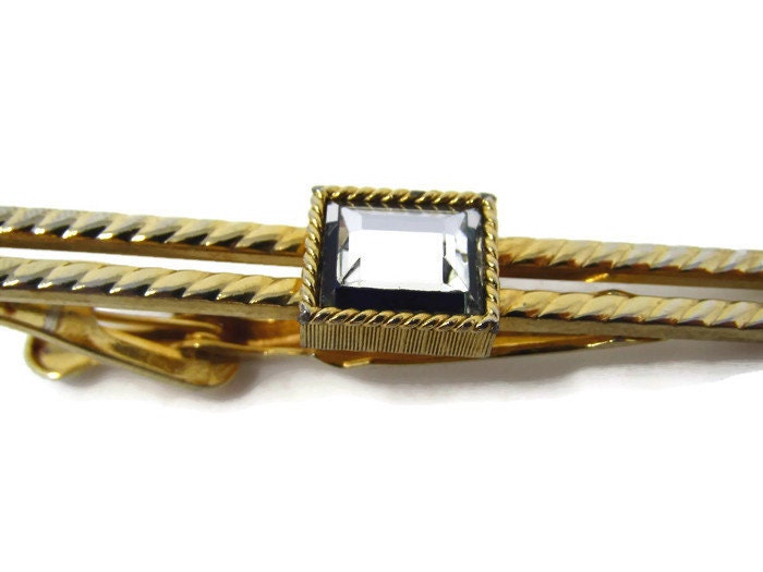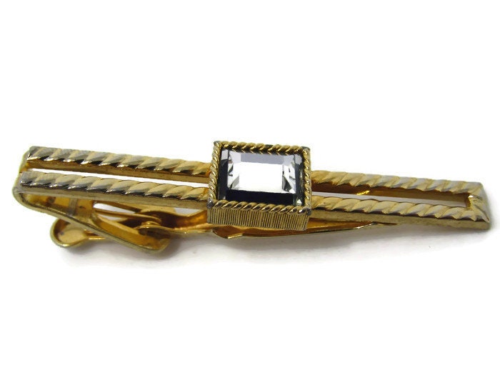 Faceted Clear Jewel Tie Clip Vintage Tie Bar: Beautiful Open Design Gold Tone