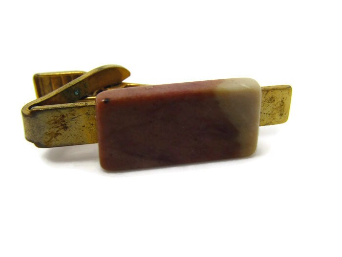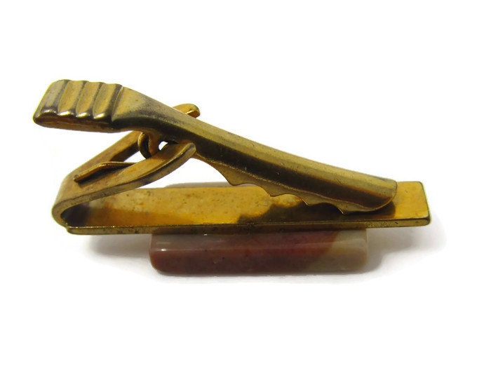 Polished Stone Tie Clip Vintage Tie Bar: Gold Tone Body
