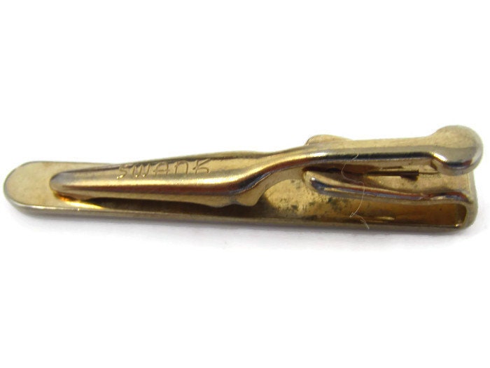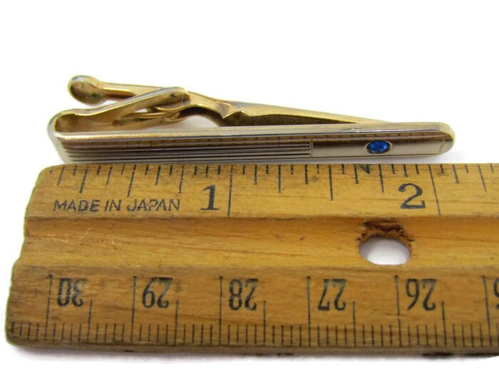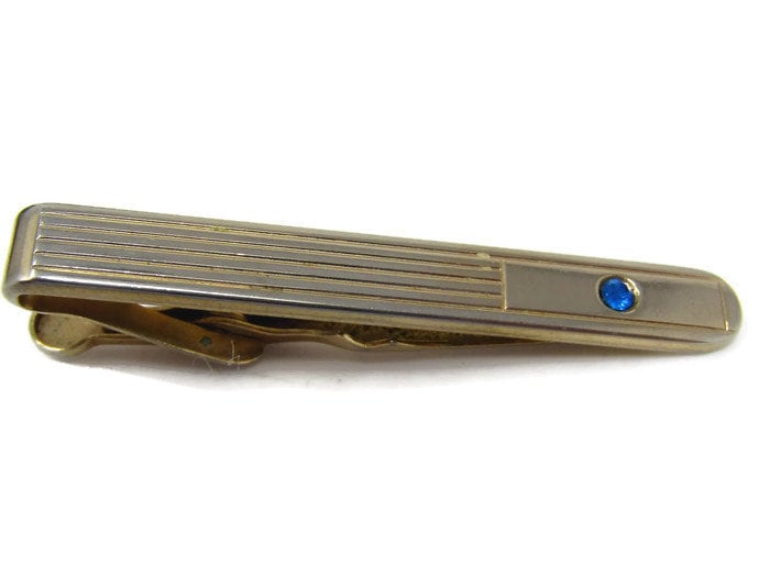 Blue Jewel Tie Clip Vintage Tie Bar: Horizontal Lines Gold Tone