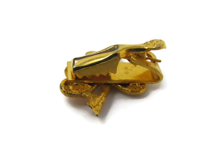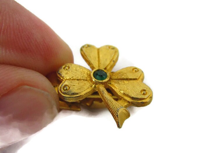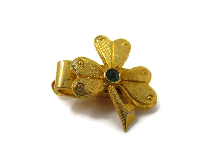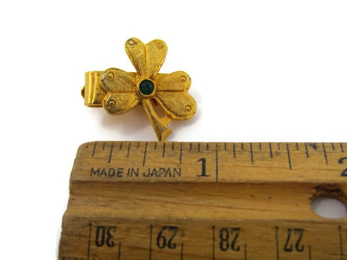Clover Green Jewel Center Tie Clip Vintage Tie Bar: Gold Tone