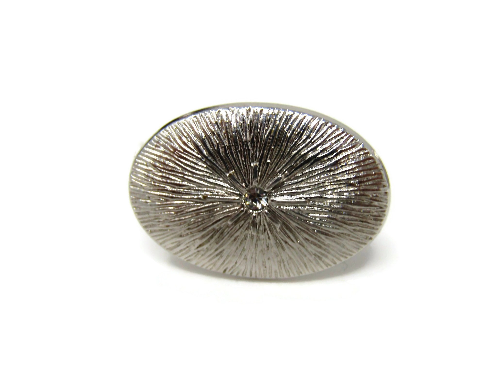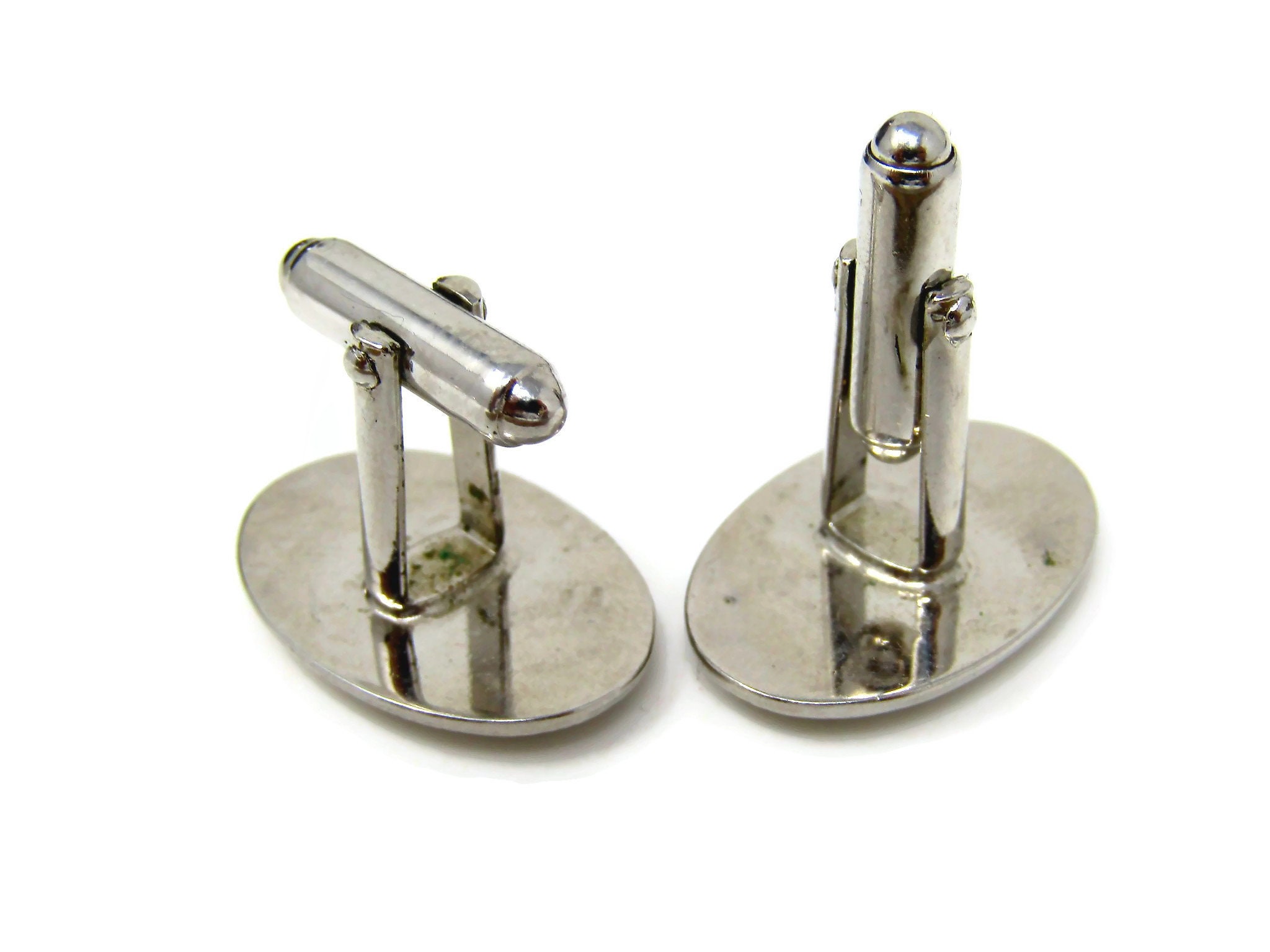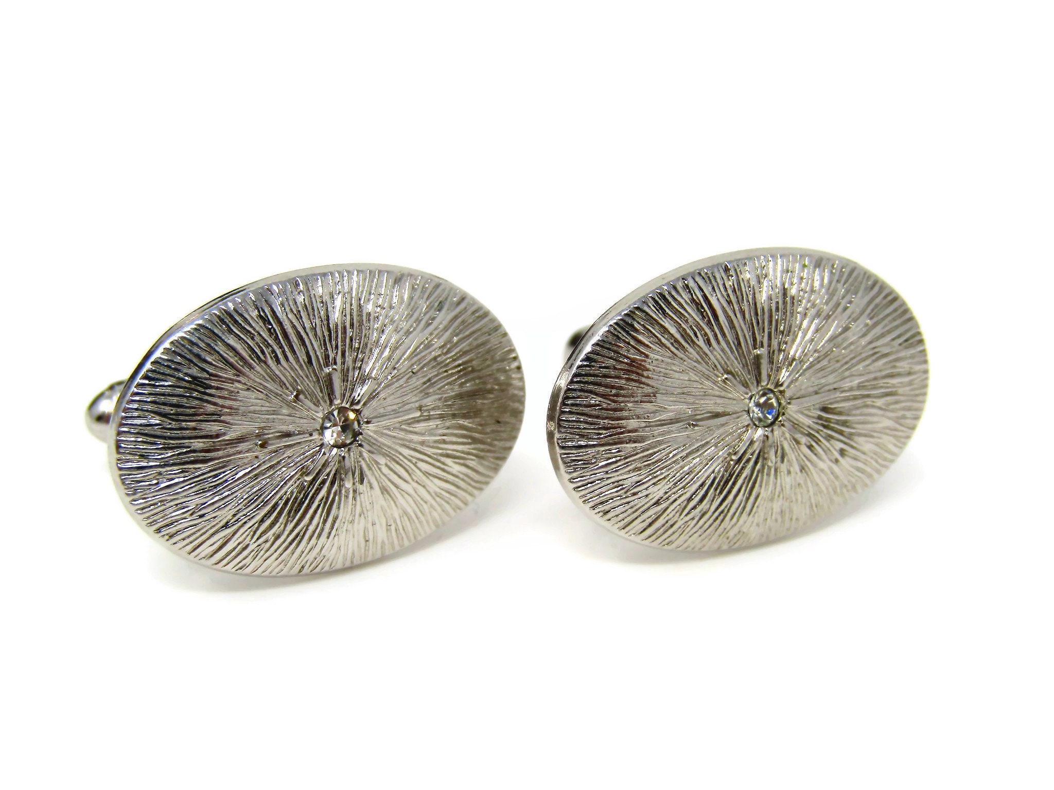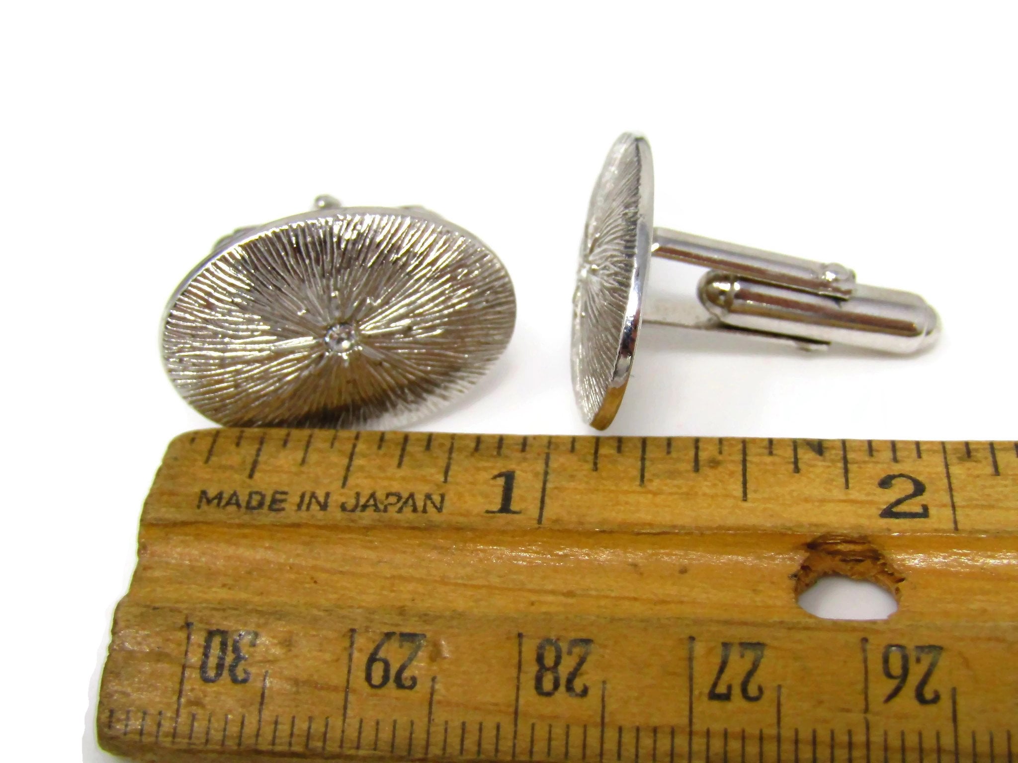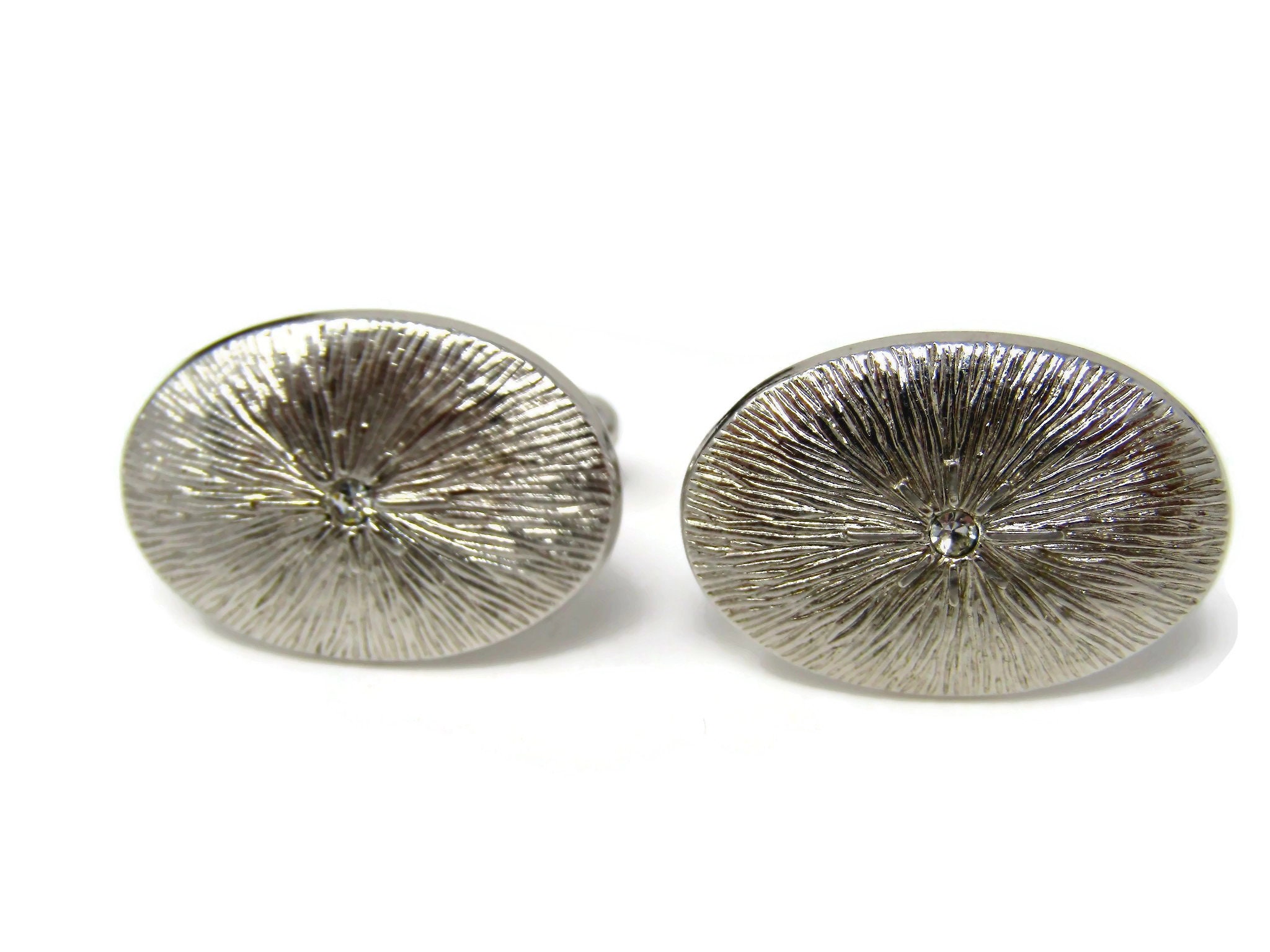 Vintage Cufflinks for Men: Textured Silver Tone Clear Jewel Center Oval Nice Design