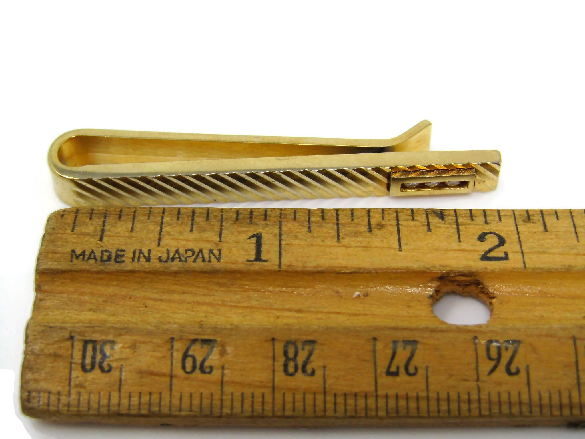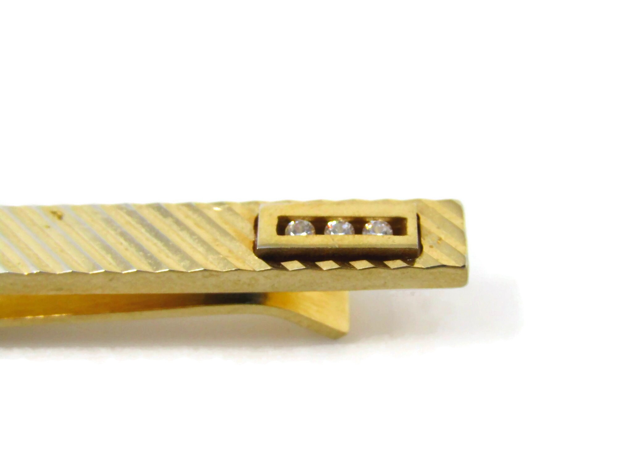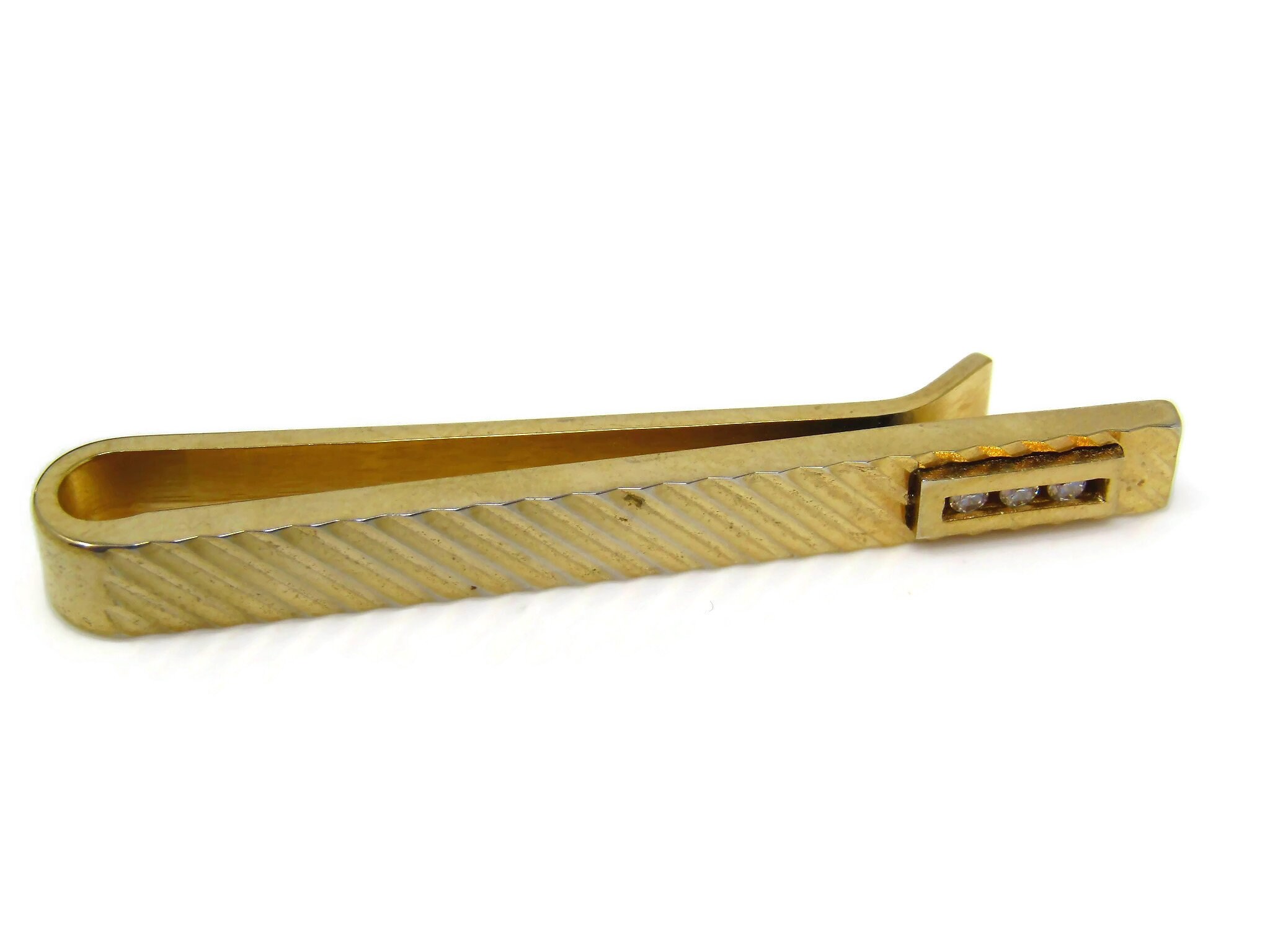 Vintage Tie Clip Bar for Men: Triple Clear Jewel Diagonal Stripe Grooves Gold Tone Design