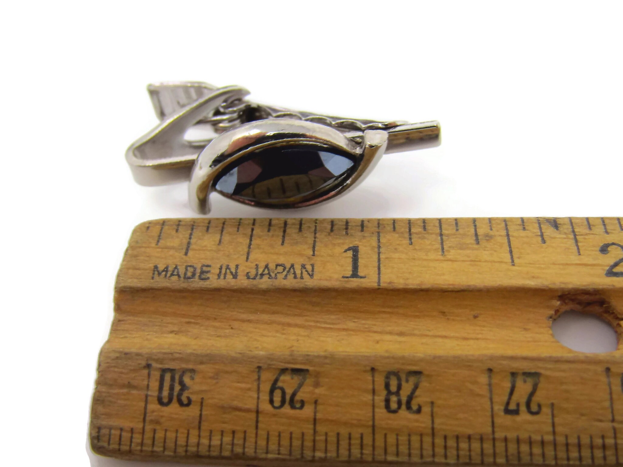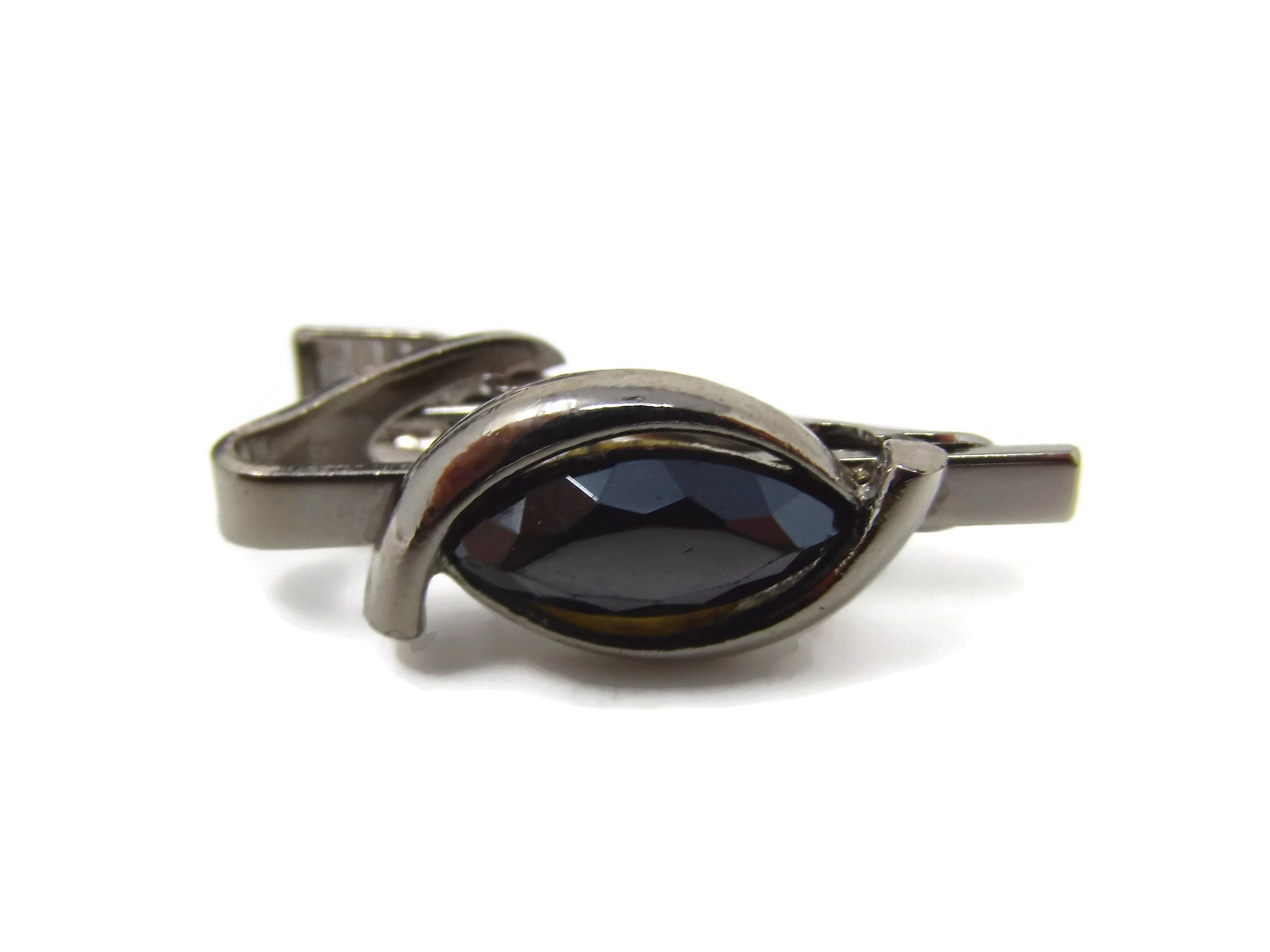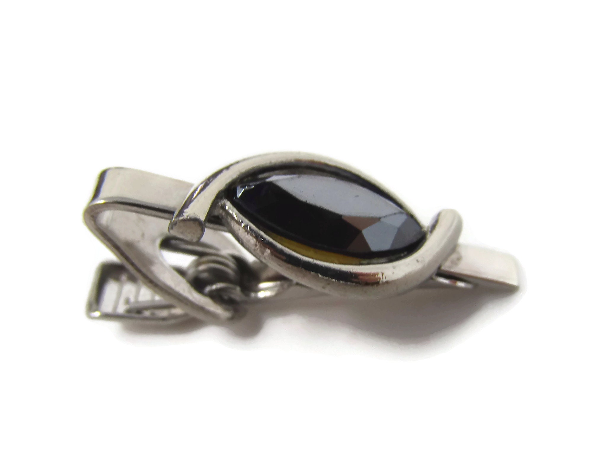 Vintage Tie Bar Clip: Dark Faceted Jewel Center Swirl Setting Silver Tone