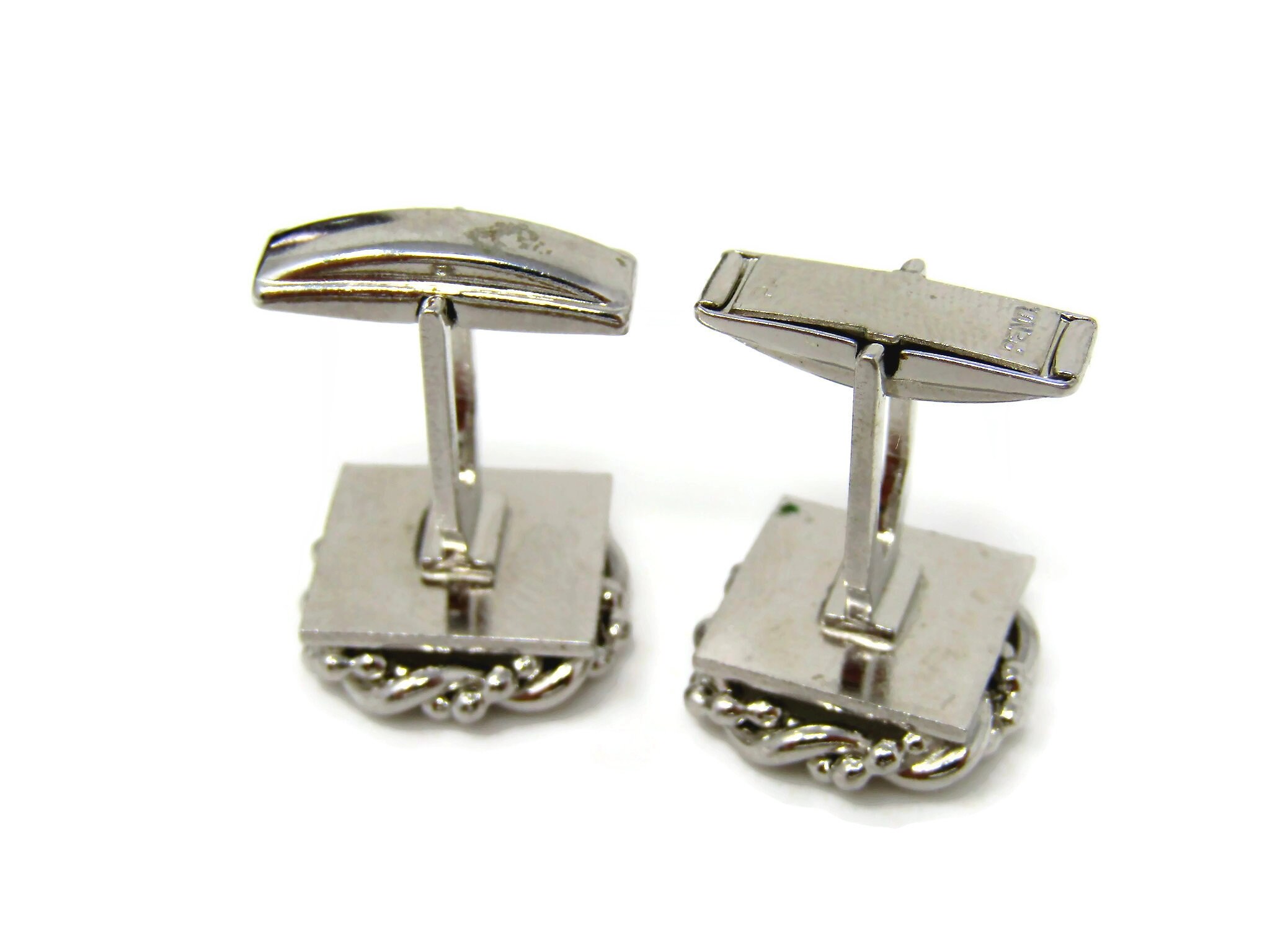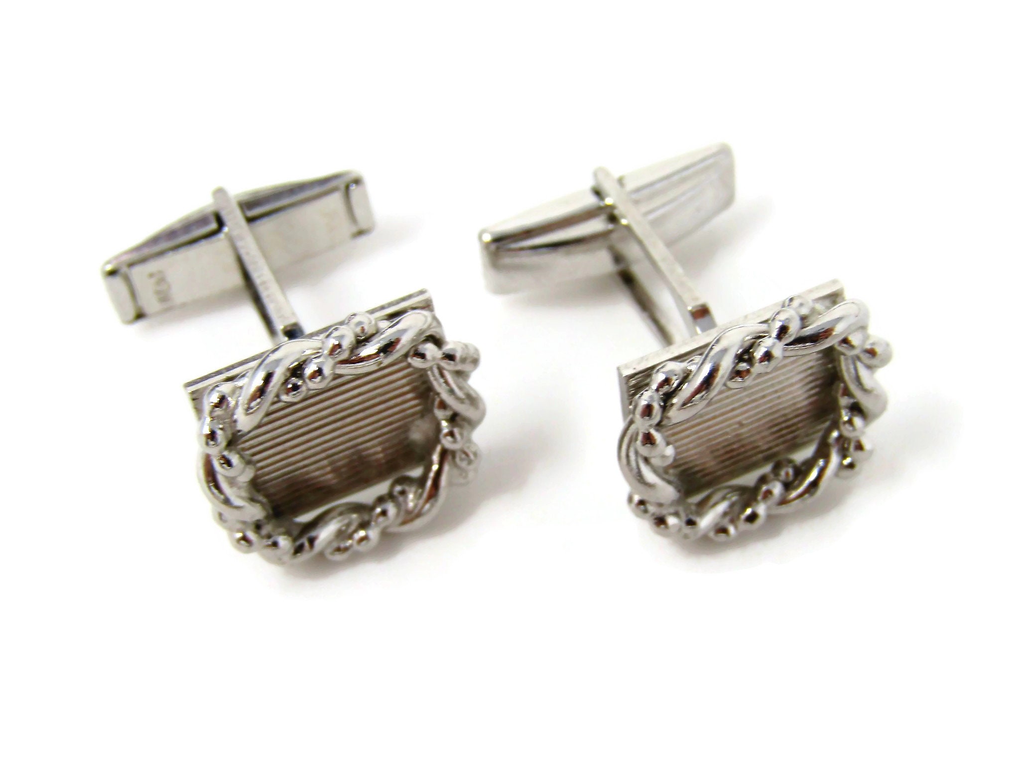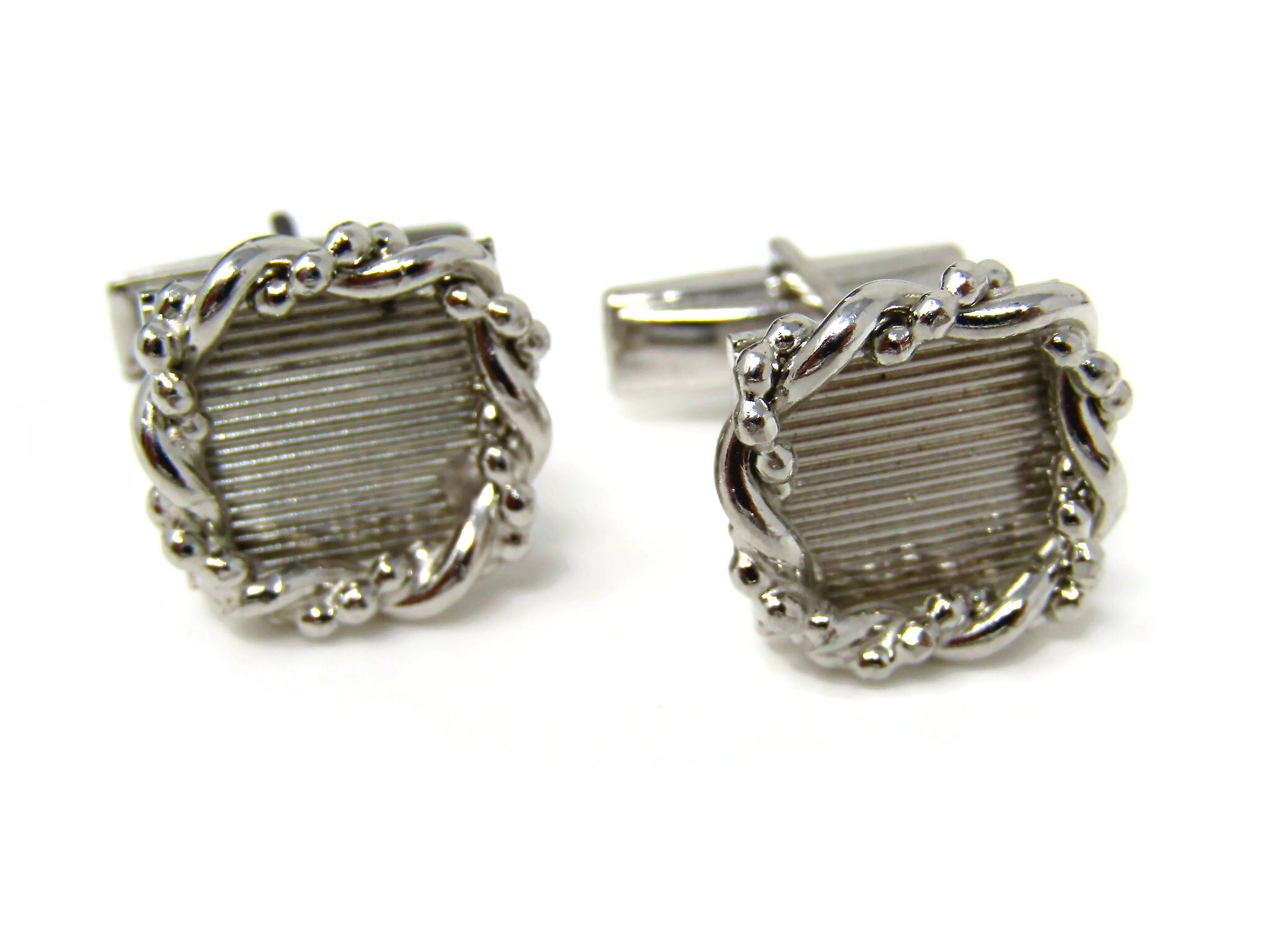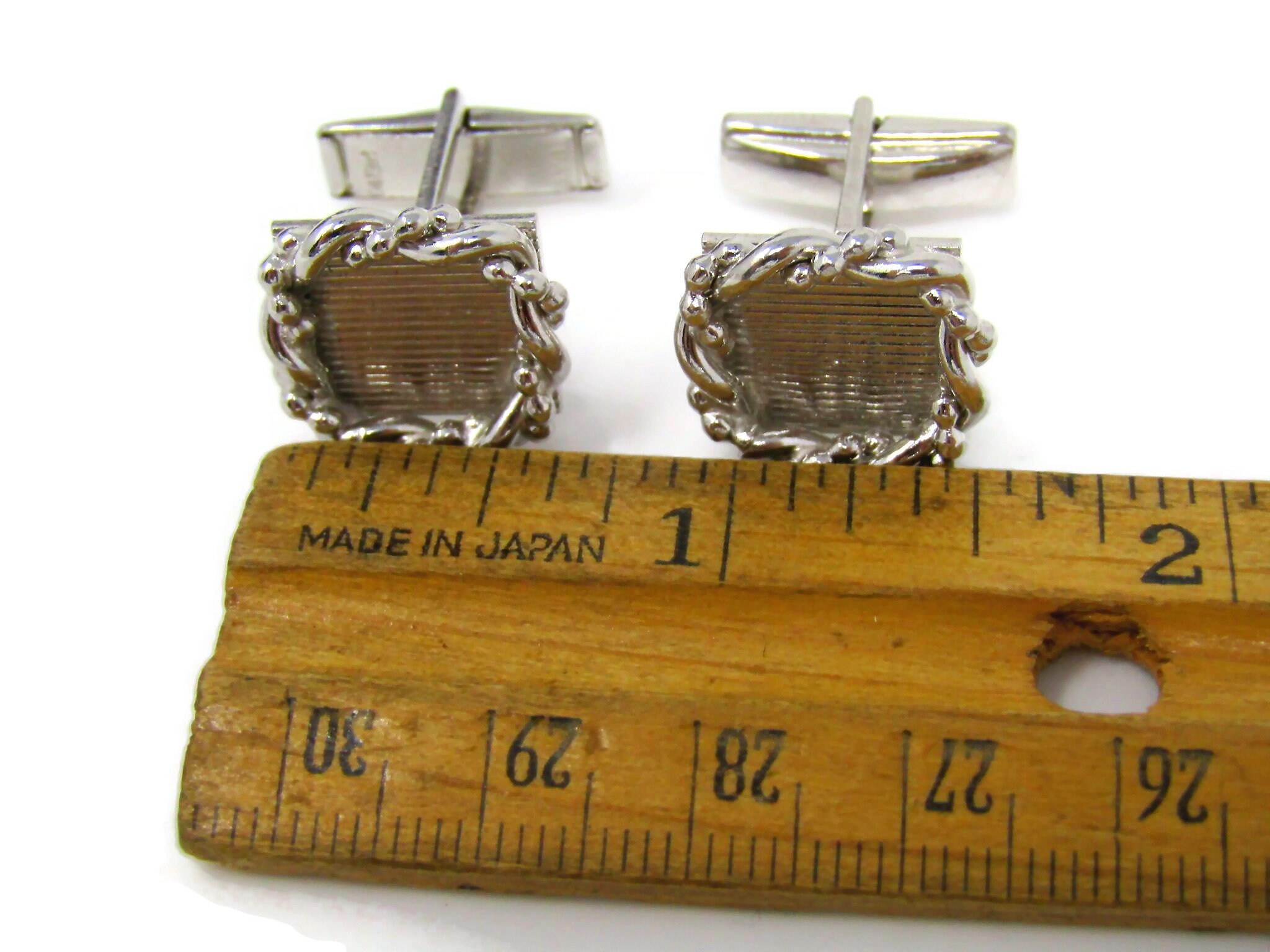 Vintage Cufflinks Ridged Center Square Shape Twist Wreath Border Silver Tone