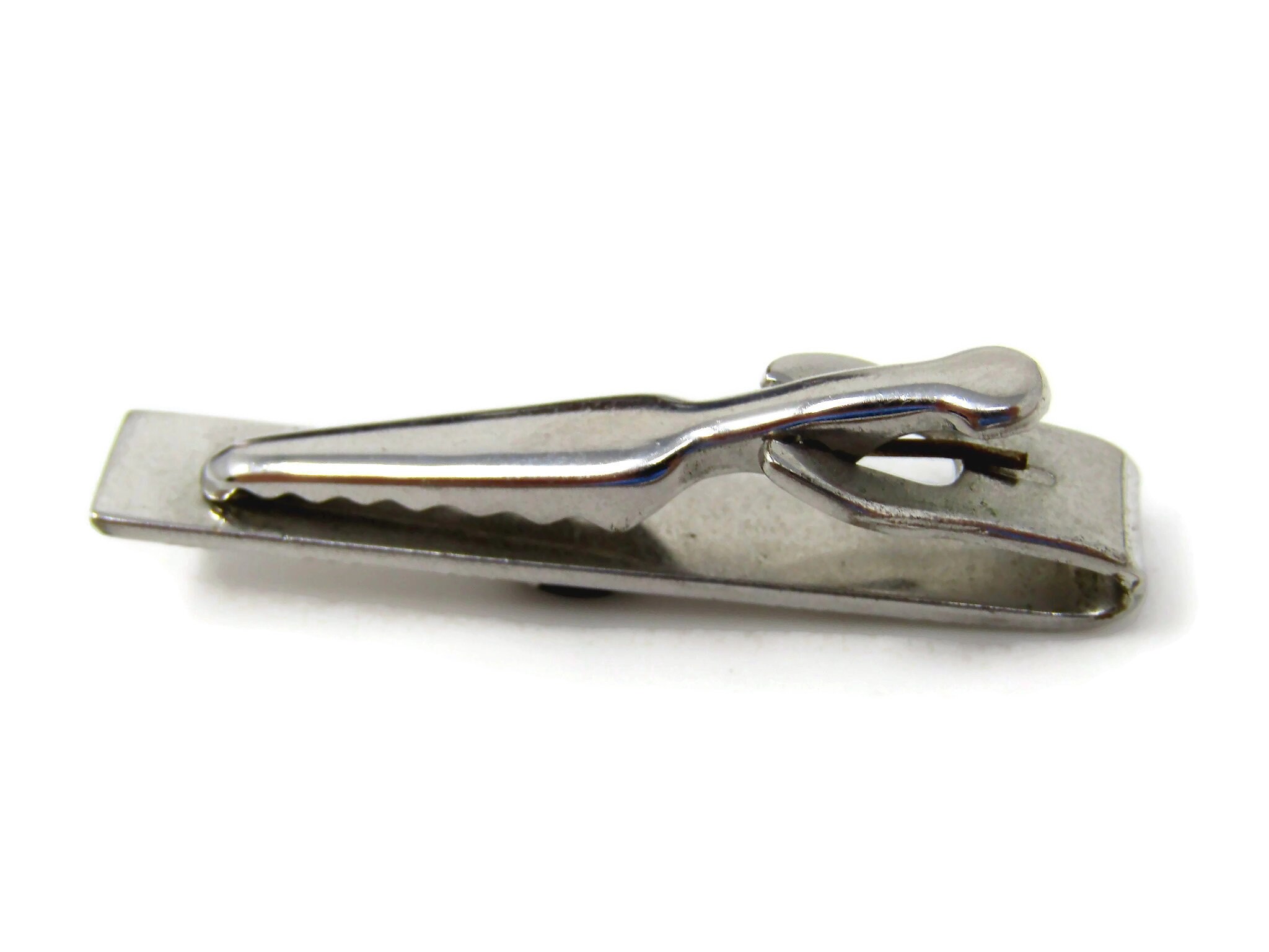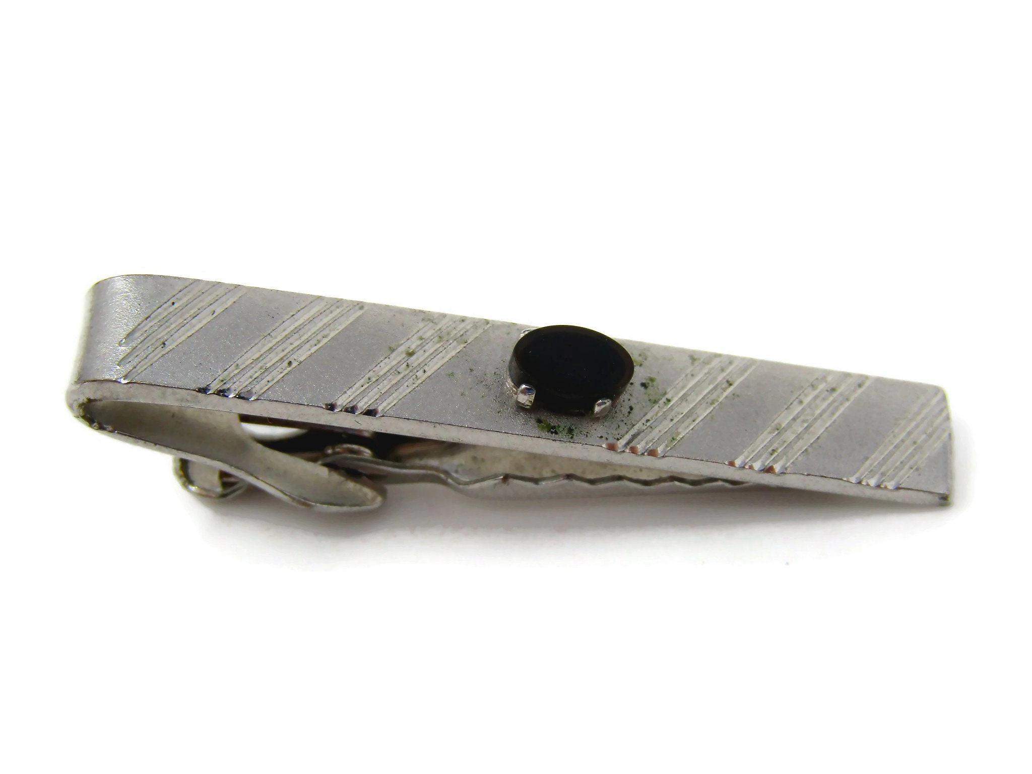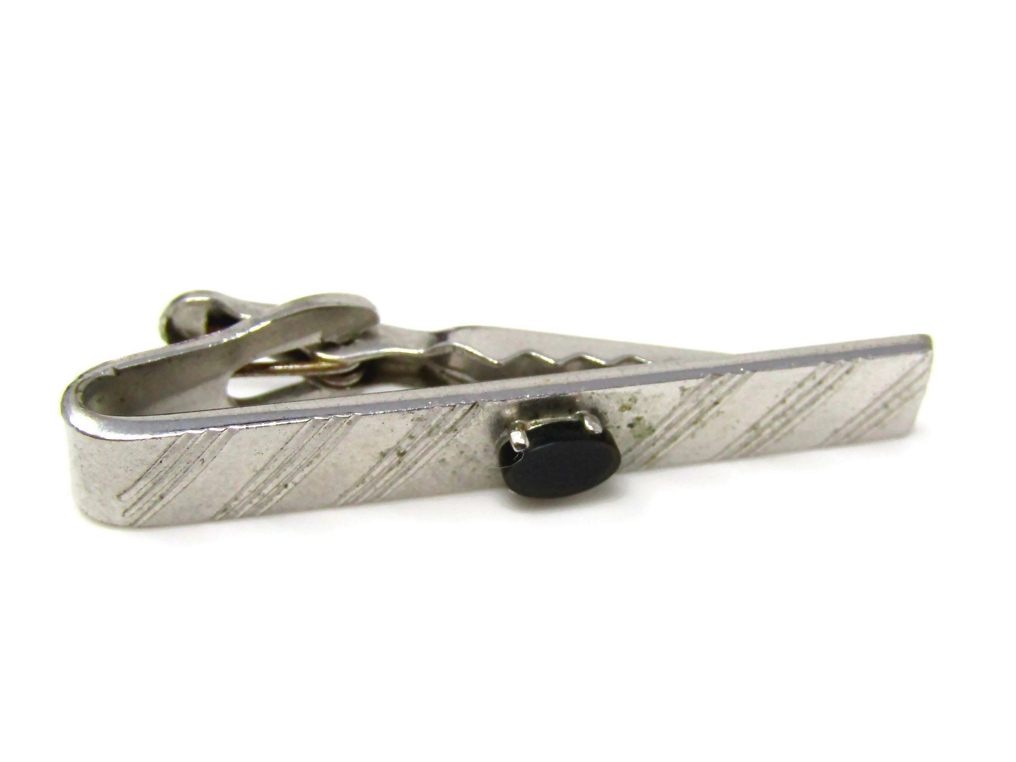 Vintage Tie Bar Clip for Men: Black Center Accent Striped Silver Tone