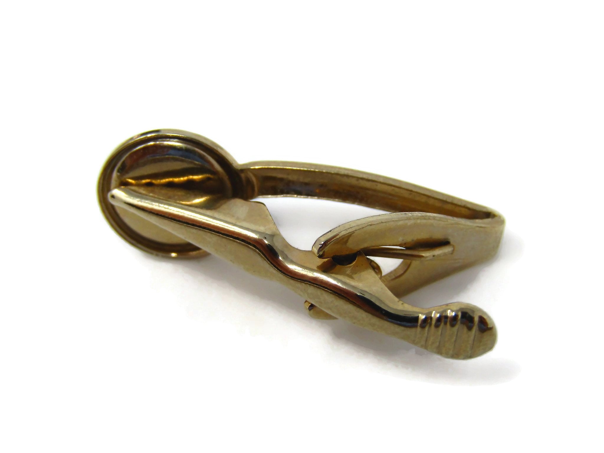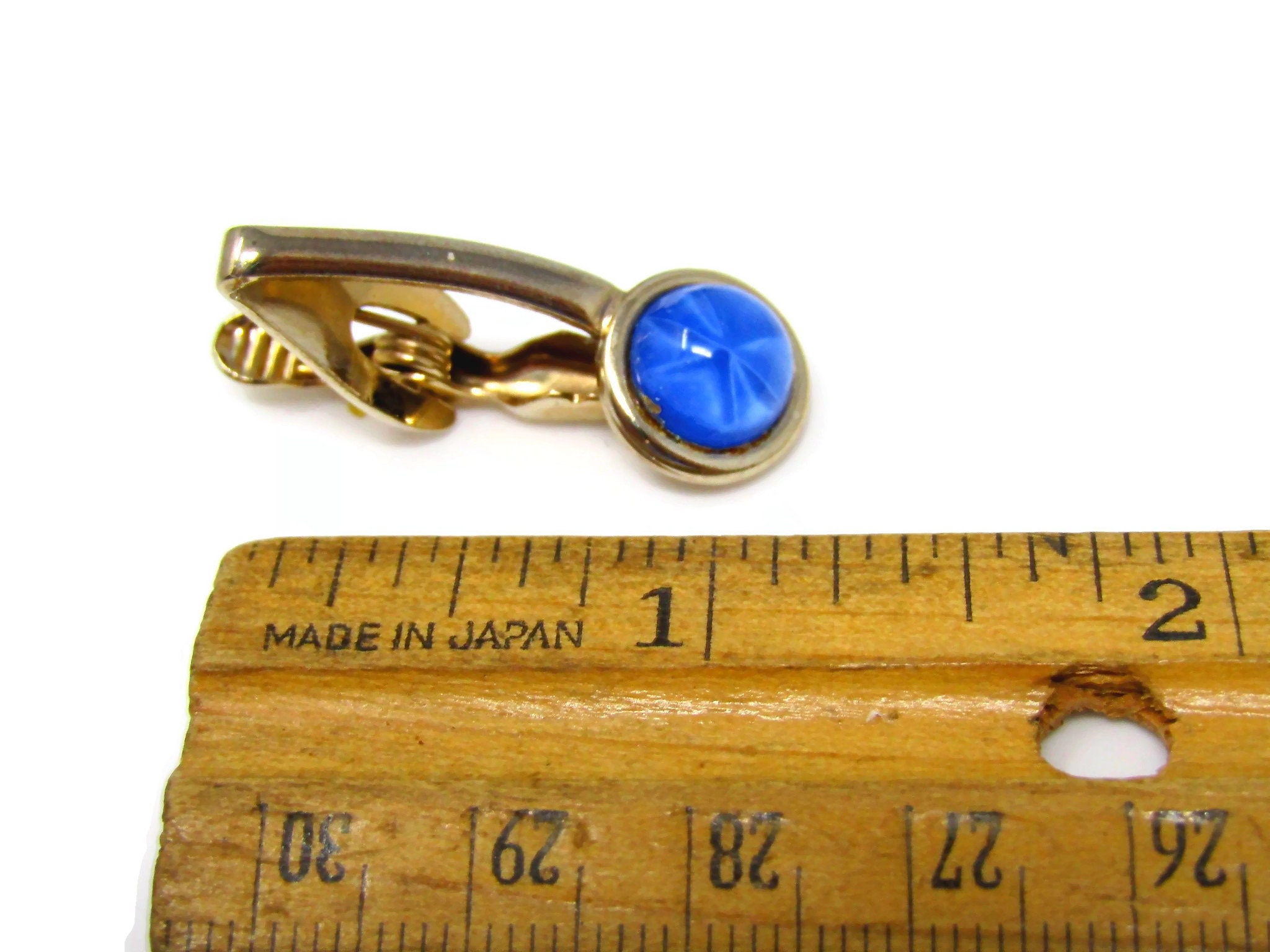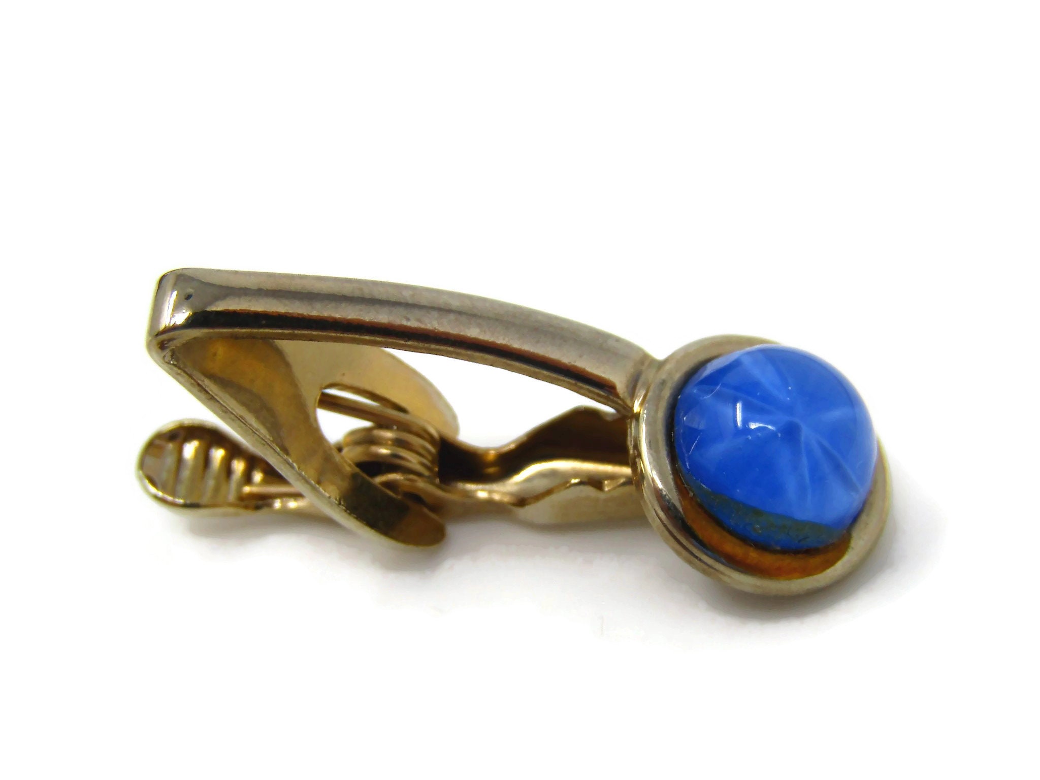 Vintage Tie Clip Bar for Men: Blue Accent Curved Body Gold Tone Design