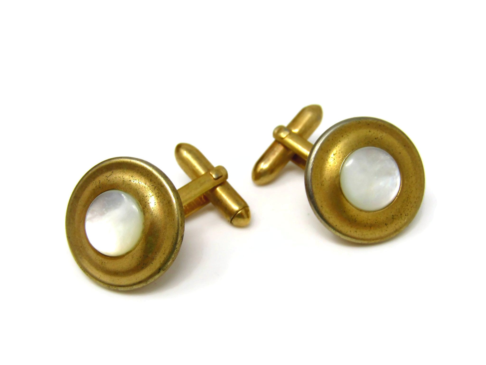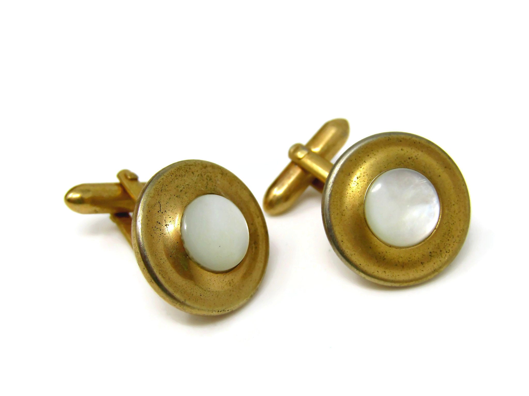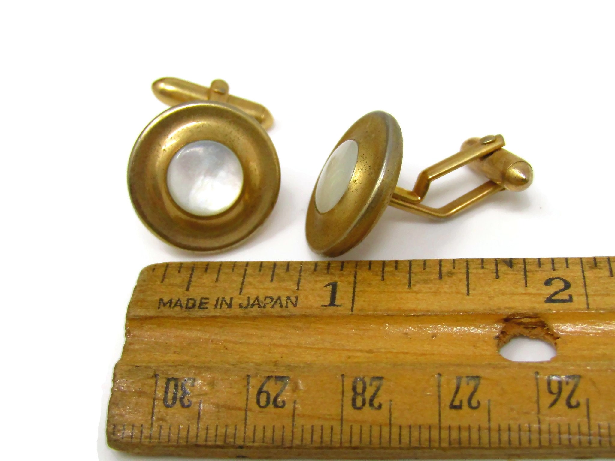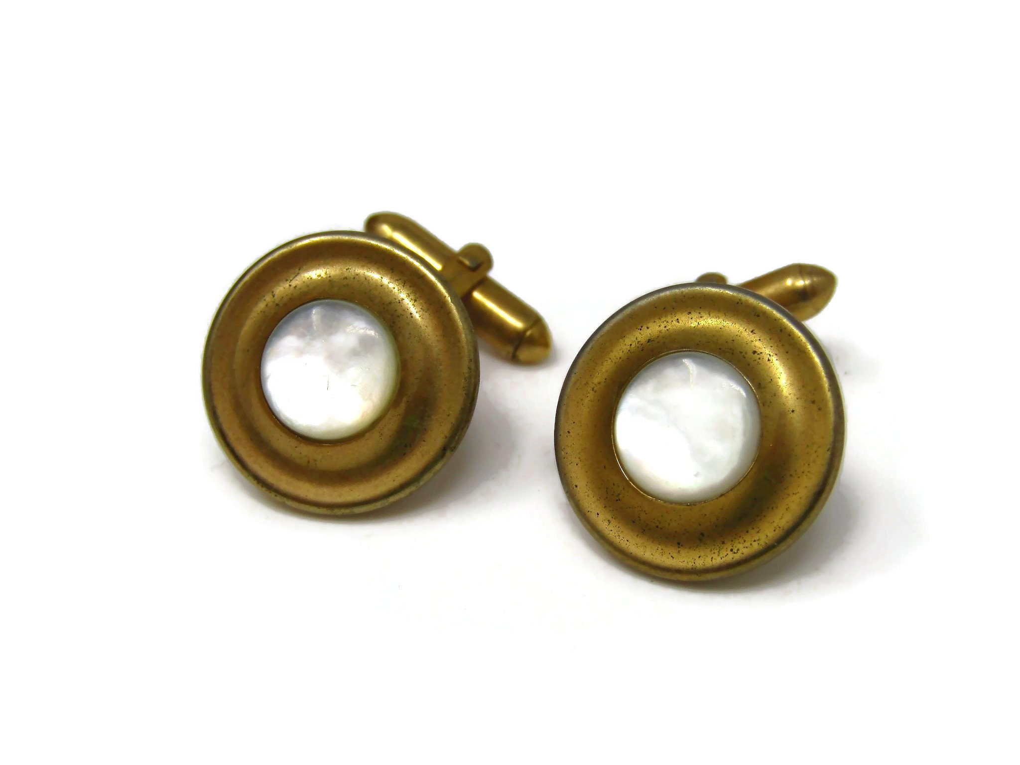 Vintage Cuff Links Cufflinks for Men Wrap Mother of Pearl Center Gold Tone Round